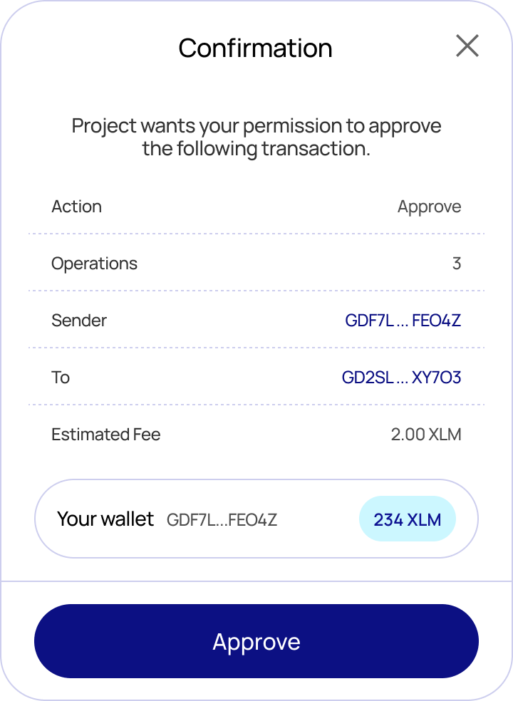 The blux.sendTransaction() method submits a signed transaction to the Stellar network. Blux shows a confirmation modal to the user before submission, displaying the transaction details, estimated fee, and the submitting account.